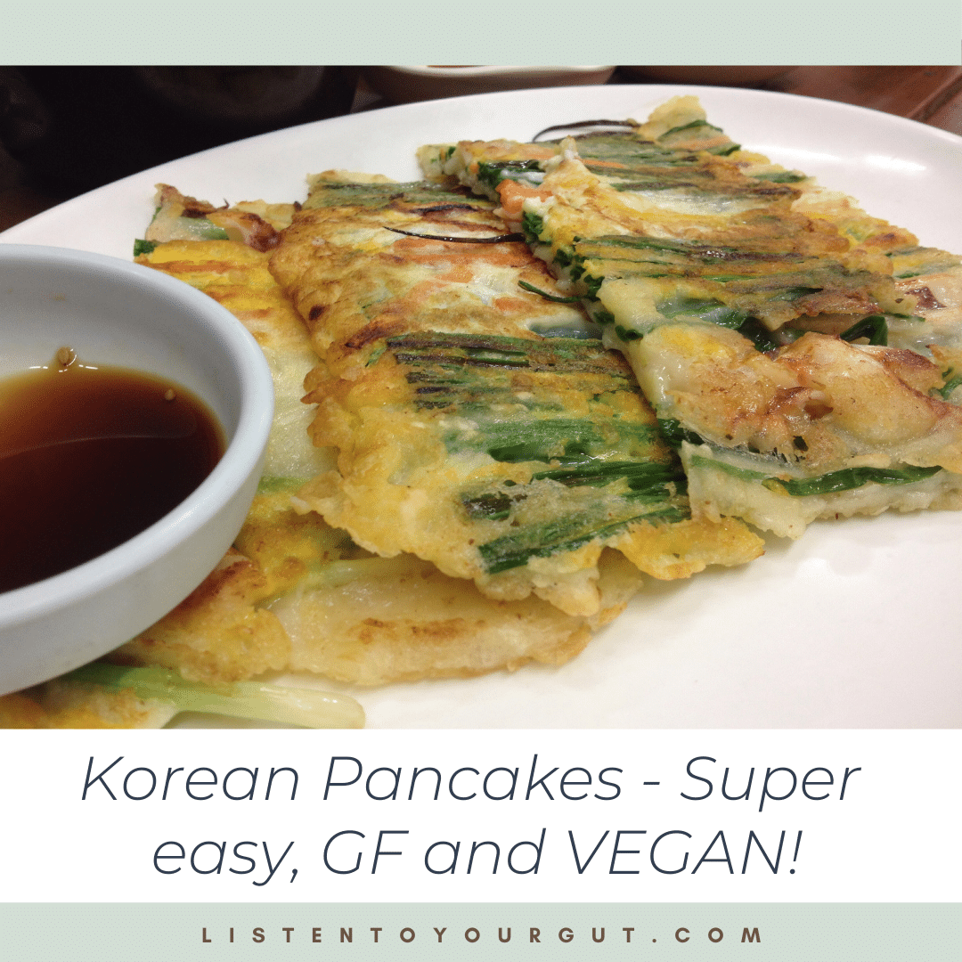 This gluten-free Korean pancake recipe is a favorite in my family – and SO easy to make! The great thing about this particular recipe is that not only are the pancakes VEGAN and GLUTEN FREE, but the batter can also be made in advance and stored in the fridge for a few days before frying – making it a very easy grab and go meal!