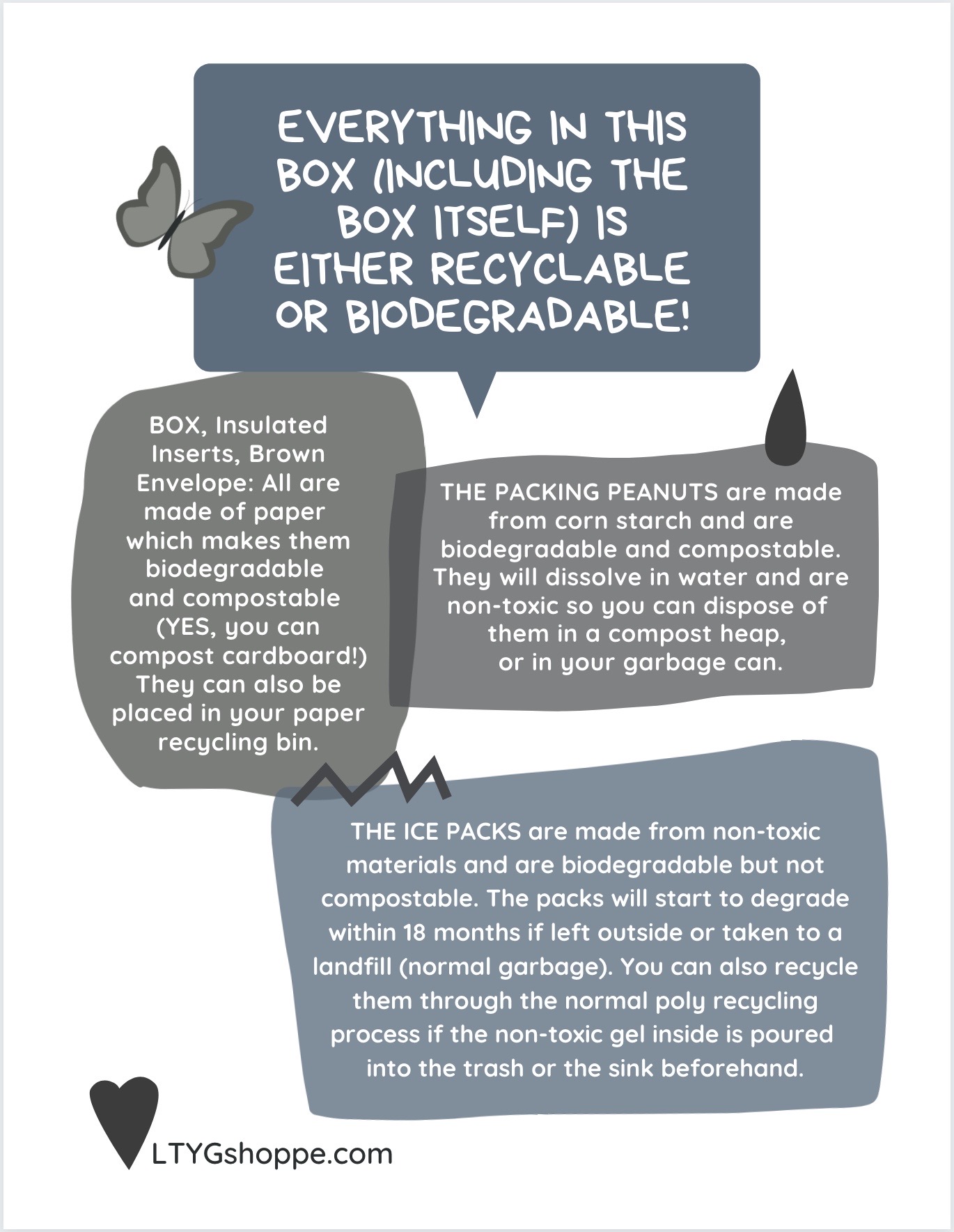 EVERYTHING in your LTYG Shoppe box (including the box itself) is either recyclable or biodegradable!