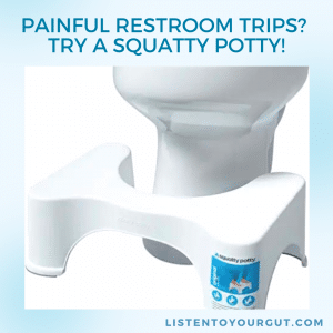 Painful trips to the toilet? Try a Squatty Potty!In Jini’s blog post, Natural Treatment for Rectal Prolapse, she explains that the Western practice of sitting on the toilet prevents the rectum from erecting and opening – making us much more susceptible to prolapse, constipation, hemorrhoids and anal fissures! It’s best to squat on the toilet or use a squatting platform like the Squatty Potty that fits around your toilet.