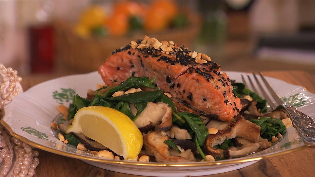 Sesame Salmon, Greens and Shitake Mushrooms Recipe