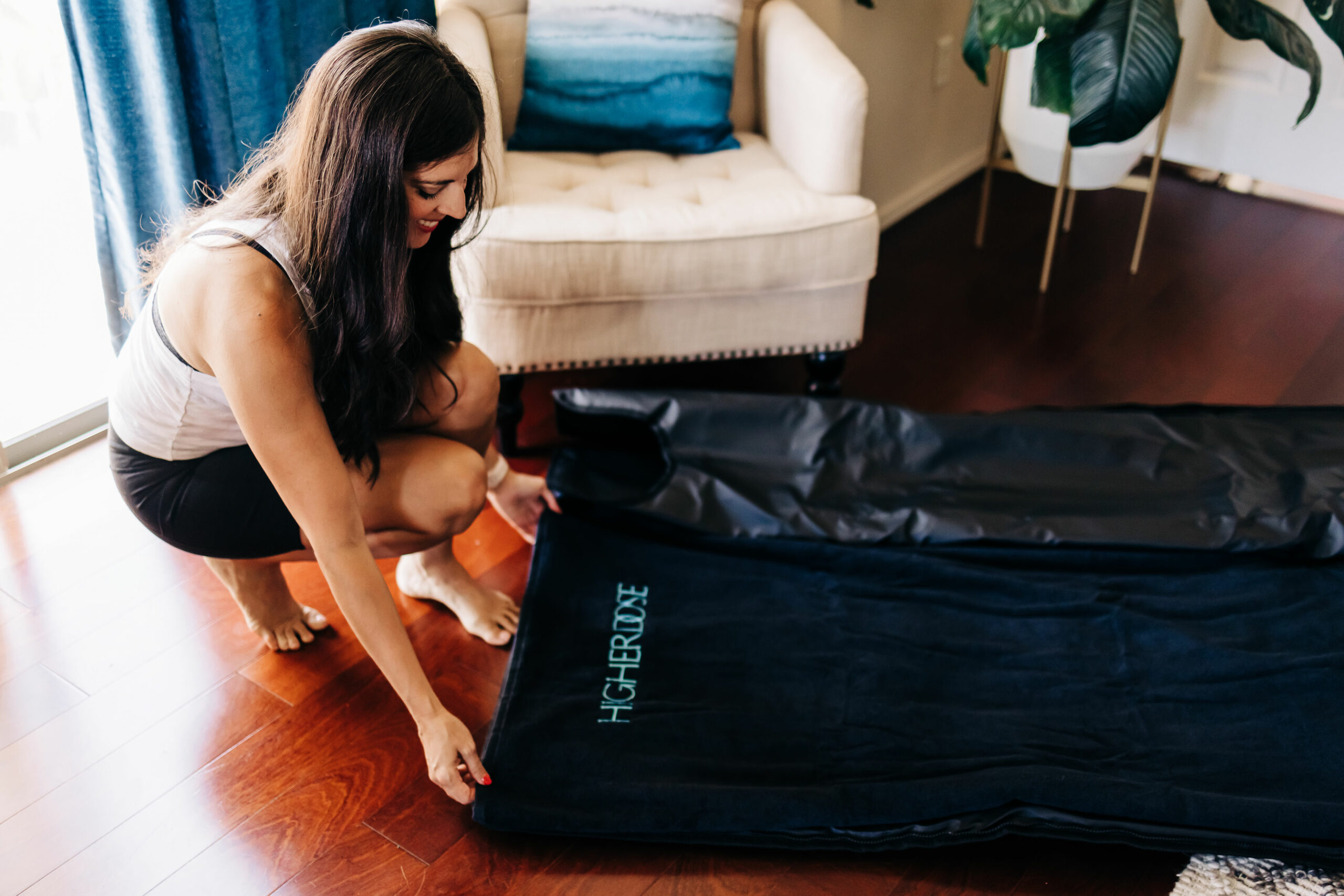 The HigherDOSE sauna blanket is a portable version of an infrared sauna for the home. It uses infrared heat (which warms your body from the inside out, rather than the other way around) along with healing tourmaline crystals, clay, and a layer of charcoal (all of which create negative ions). In addition, it is made of non-toxic materials and has extremely low EMF interference. So there is no radiation to your body while you relax and sweat.